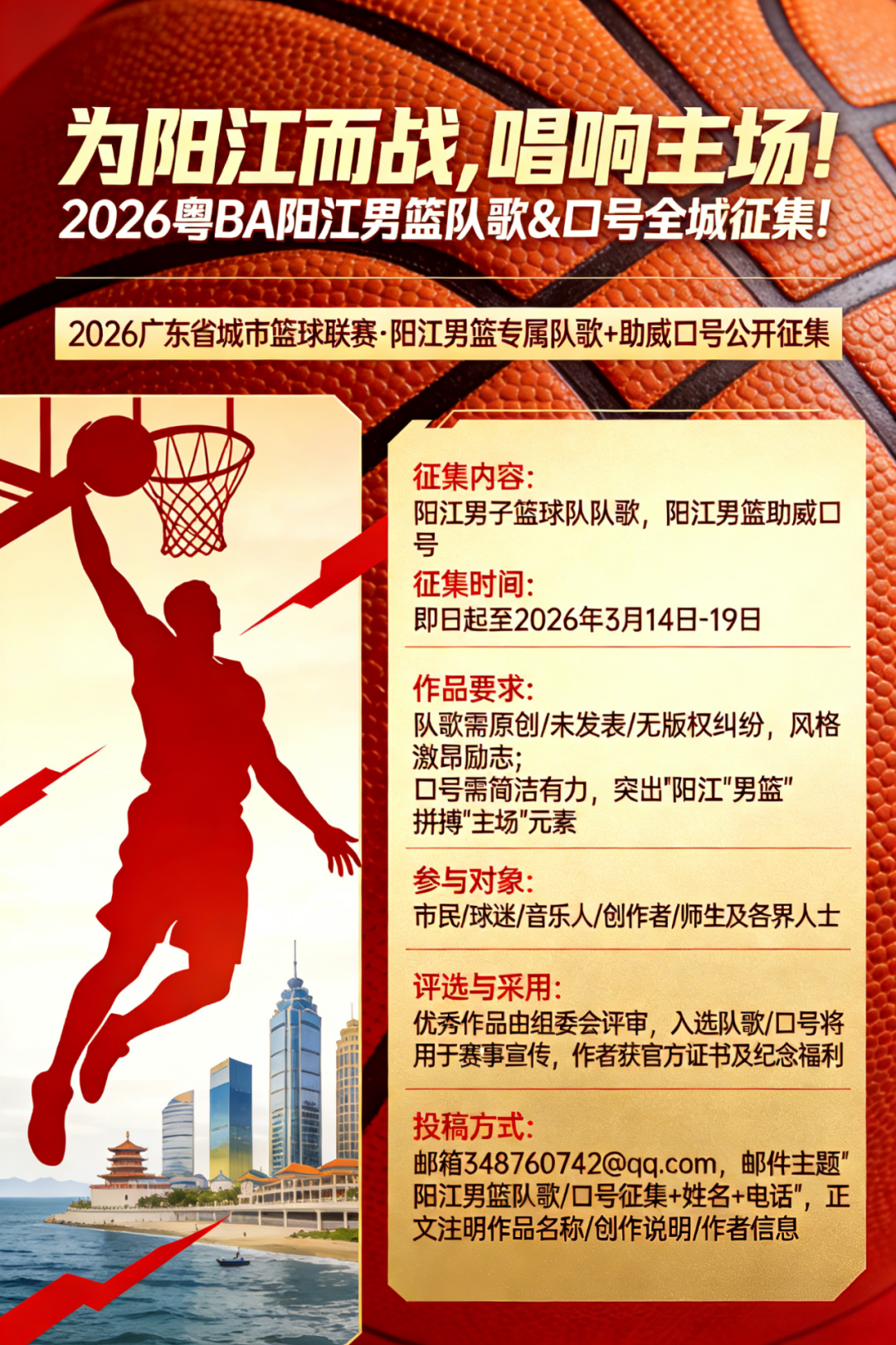 邮件主题:阳江男篮队歌/口号征集 + 姓名 + 电话